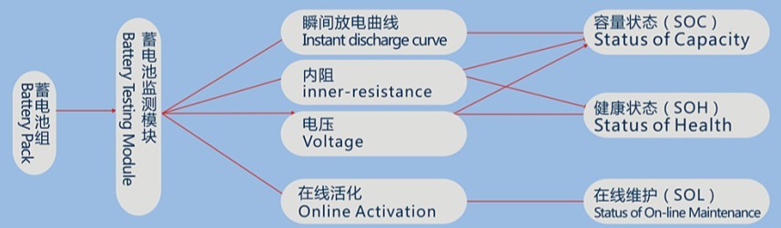 采集单元与内阻单元采集电池电压与内阻数据上传给控制单元,控制单元对数据进行处理后通过RS485总线上传到监测电脑或监测单元上显示。同时控制单元可以控制容量单元对蓄电池组进行核对性放电,单体电压下限、组压下限、已放容量、已放时间等条件中的一个满足后可自动停止并记录容量。